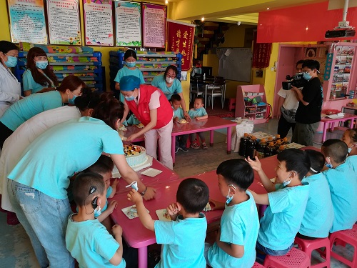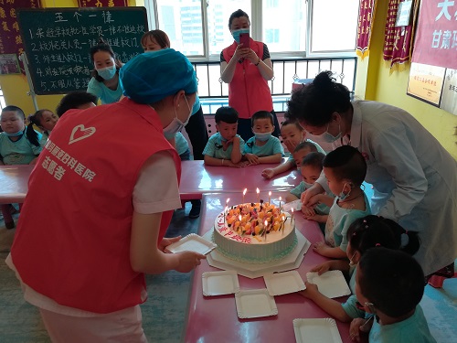 启聪中心的孩子们也因奶奶、叔叔阿姨的到来而感到兴奋,坐在医生奶奶怀里,幸福地说着自己的成长故事。“许愿、分享六一生日蛋糕,启聪中心的孩子们过六一啦”,大家一起齐唱着生日快乐歌,在孩子们的美好愿望中,由玛丽亚医院内科张瑞兰主任、启聪中心王亚丽园长和孩子们共同切蛋糕,在孩子们分享美味蛋糕的快乐时光中医院结束了一下午有意义的爱心慰问活动。